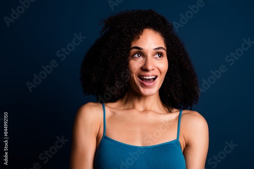 No filter photo of impressed funny lady underwear lingerie accept imperfections looking empty space isolated blue color background