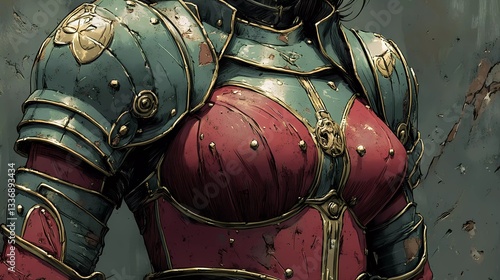 Noble female knight in plate armor, prepared for combat, symbolizing medieval chivalry, heroism, and warrior spirit, perfect for storytelling visuals, hand-drawn book illustration