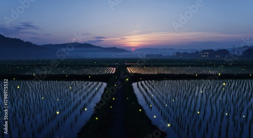 Nocturnal scene of a rice paddy at twilight with fireflies, hills, and a fading sunset