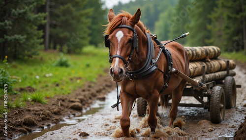 Noriker draught horse pulling logs through muddy forest, resilient strength