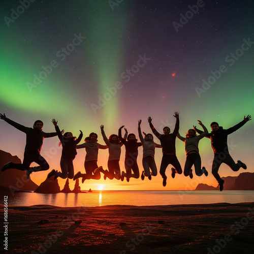Northern Lights Jump: A group of silhouetted individuals leap for joy against the vibrant backdrop of the Aurora Borealis dancing across a starlit sky.