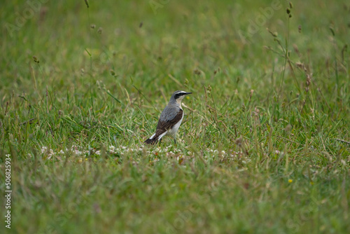 Northern Wheatear (Oenanthe oenanthe) perched on grass