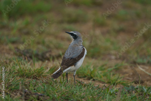 Northern Wheatear (Oenanthe oenanthe) perched on grass