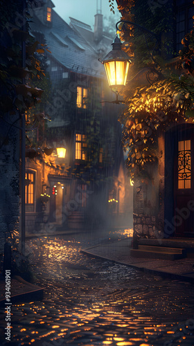Nostalgic Glow: An Old-fashioned Streetlight Illuminating a Tranquil, Misty Cobblestone Street at Night