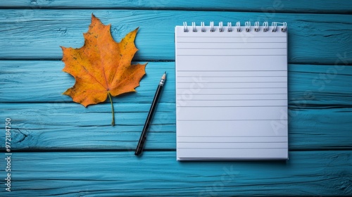 Notebook with a pencil and autumn leaf placed on a turquoise wooden surface for a seasonal writing or planning setup.