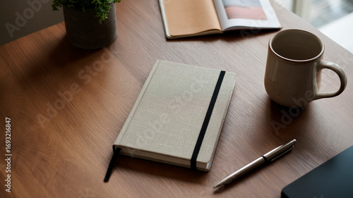 Notebook with pen and coffee cup on wooden office desk workspace