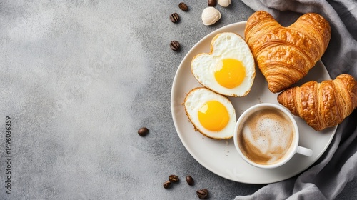 Nourishing breakfast with heart-shaped eggs, croissants, and coffee on grey background, top view.