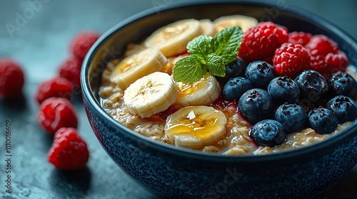 Nourishing Oatmeal Bowl with Fresh Berries and Banana Slices Drizzled with Honey Healthy Breakfast Concept
