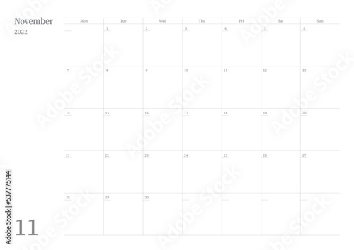 November 2022 calendar template design illustration is simple style. Memo, scheduler, diary, calendar, memo, planner document template background.