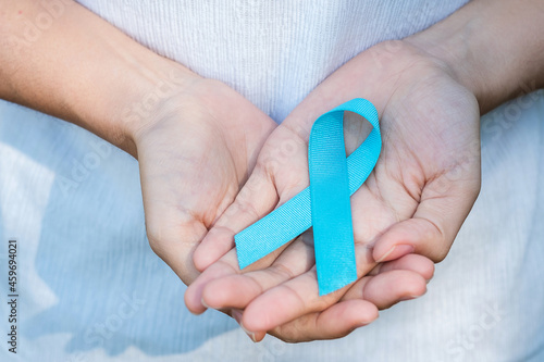 November Prostate Cancer Awareness month, woman holding Blue Ribbon for supporting people living and illness. Healthcare, International men, Father, World cancer day and world diabetes day concept