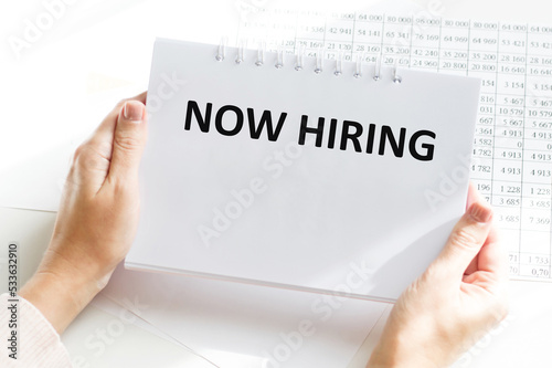 NOW HIRING inscription on a notebook in the hands of a businessmanI am a business concept