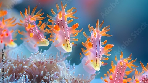 Nudibranchs in various species, vibrant colors, underwater macro: A macro shot captures a group of nudibranchs in various species, their vibrant colors and intricate patterns creating a stunning