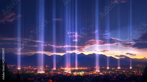 Numerous light beams emanating from the sky in symmetrical lines, illuminating an urban landscape at night with mountains and city lights in the background. Metropolis of Light Beams. Illustration