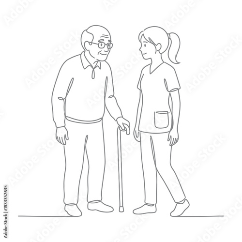 line art, minimalist, man, cane, care, nurse, elderly, health care, assisting, aid, old, help, walk, carer, human, woman, clinic, doctor, family, people, senior, simple, vector, comfort, medicals, outline, patient, service, support, hospital, mobility, provider, gentleman, geriatric, treatment, assistance, friendship, interaction, illustration, human relationships, drawing, healing, nursing, well-being