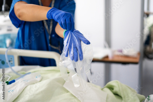 nurse, glove, disposable, plastic, medicals, health care, hospital, hygiene, protection, caregiver, doctor, scrub, uniform, prevention, safety, sterile, exam, closeup, health, medicine, professional, man, woman, clinic, treatment, clean, hand, arm, wearing, working, job, occupation, equipment, medical equipment, ward, pandemic, virus, disease, infection, assistance, helping, professionalism
