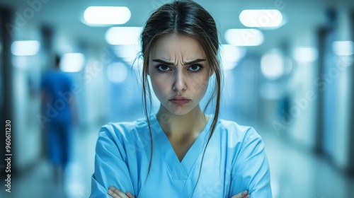 Nurse suffering from occupational health issues, tired expression, hospital background