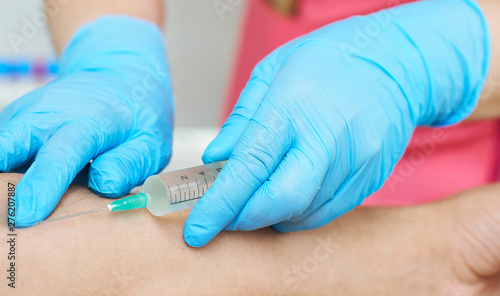 Nurse with a syringe in her hand is going to take a patient's blood sample for a blood test at the hospital.