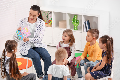 Nursery teacher and group of cute little children learning numbers in kindergarten. Playtime activities