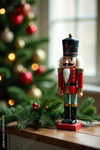 Nutcracker figurine placed on a wooden table with fir branches surrounding it, Christmas tree, Christmas decorations, wooden table