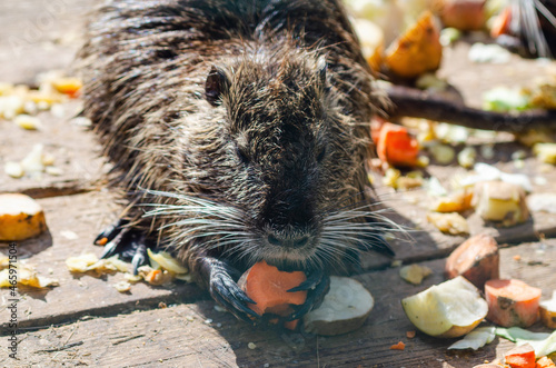 Nutria eats carrots while holding it in its paws