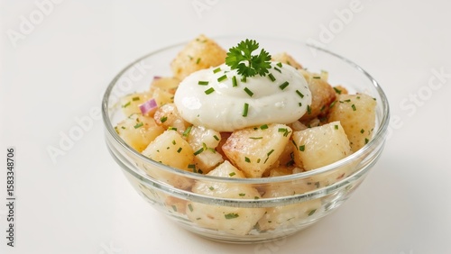 Nutritious potato salad mixed with homemade mayo served in a clear bowl.