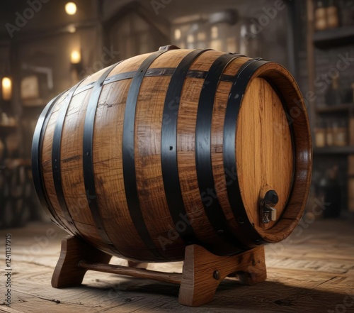 Oak barrel with a richly colored whiskey inside, whiskey, alcohol content, liquid