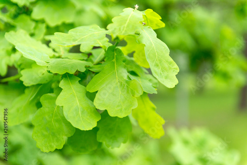 oak branch with young green leaves, oak leaves on a green background