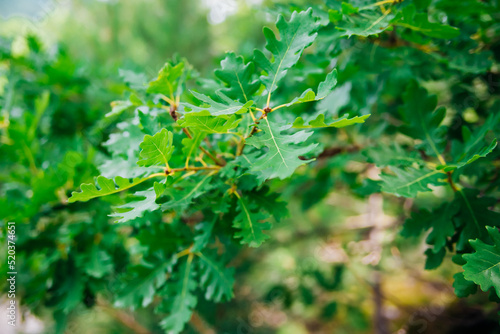 Oak leaves close-up. Tree branches with fresh green leaves. Spring background. Park or forest.