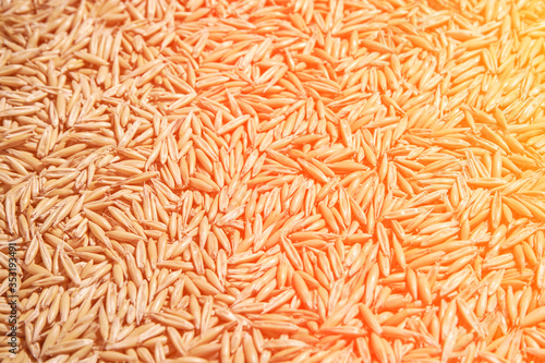 Oat grain texture. Natural organic market. Closeup ecology. Farming flakes view. Groats wallpaper. Whole oatmeal background. Crop cereal seeds. Brown and yellow heap. Hard shadows. Sun day