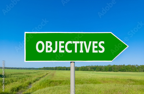 Objectives symbol. Concept word Objectives on beautiful green road sign. Beautiful blue sky green grass and forest peaceful nature background. Business objectives concept. Copy space.