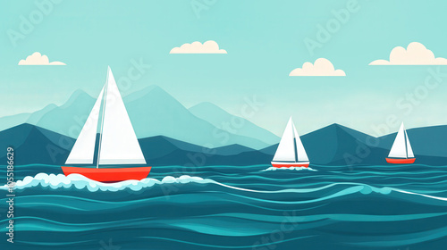 Ocean Sailing Adventure, vibrant flat design illustration showcasing various boats gliding over dynamic waves under a bright sky, capturing the essence of maritime exploration.