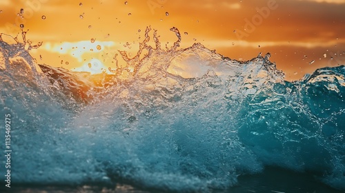 Ocean Wave Splash at Sunset. Powerful Nature, Sunrise, Ocean.