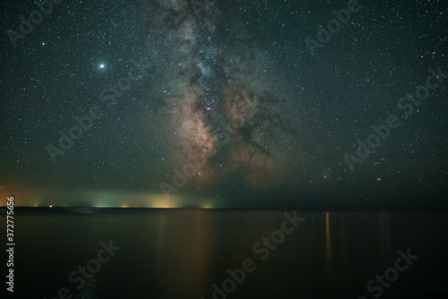 Ocean with star background. Starlight in deep universe. Milky way galaxy