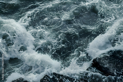 Ocean's Fury: A close-up of churning ocean waves crashing against rocky shores, capturing the raw power and untamed beauty of nature's force.