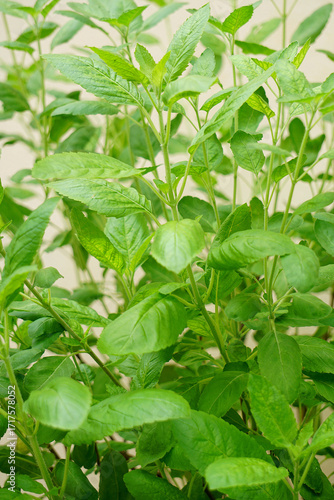 Ocimum tenuiflorum leaves grown in a kitchen garden with among green leaves and soft blurred style for background. It is considered a Thai herb.