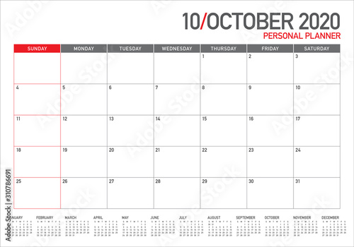 2020, october, calendar, desk calendar, month, monthly, new, year, planner, printable, date, day, template, design, vector, simple, clean, schedule, illustration