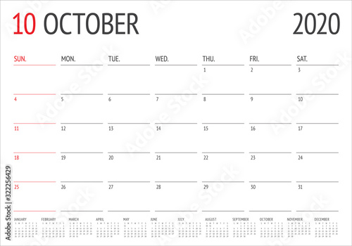 2020, october, calendar, desk calendar, month, monthly, new, year, planner, printable, date, day, template, design, vector, simple, clean, schedule, illustration