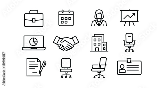 office, business, work, icon, briefcase, laptop, pie chart, graph, document, chair, calendar, handshake, manager, workplace, job, company, corporate, id card, contract, presentation, boardroom, teamwork, chart, organisation, management, people, structure, businesswoman, professional, employee, report, monitor, signature, office equipment