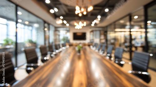 Office blur meeting room blurred background of blurry boardroom presentation with work desk for business discussion, corporate conference, enterprise seminar.Suitable for corporate and business theme