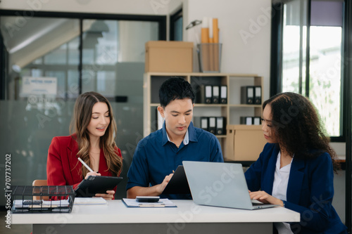 Office colleagues have a casual discussion. During a meeting in a conference room, a group of business teem sit in the conference room