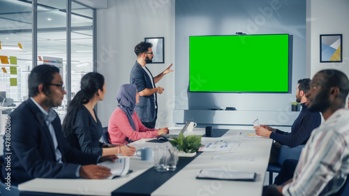 Office Conference Room Meeting Presentation: Hispanic Businessman Talks, Uses Green Screen Chroma Key Wall TV. Successfully Presenting a Product to Group of Multi-Ethnic Investors. e-Commerce Strategy