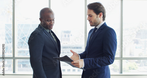 Office, document and meeting with business men together with proposal discussion. Paperwork, partnership and B2B contract with employee for introduction to corporate seminar, networking or workshop