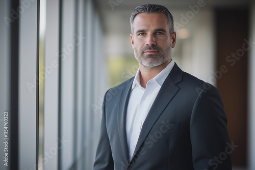 Office executive standing confidently in a corporate office background