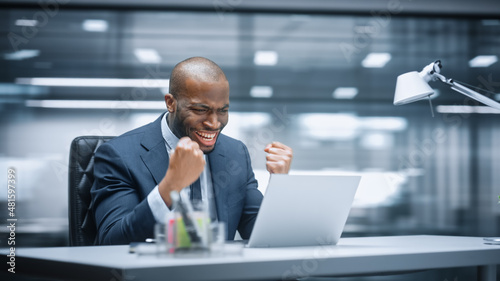 Office: Happy Successful Black Businessman Sitting at Desk Using Laptop Computer, Celebrate Success. Entrepreneur in Suit working with Stock Market App Smiles, Happy Victory. Motion Blur Background.