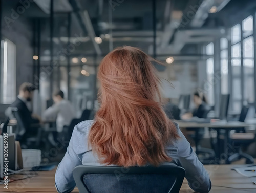 office, men at work, back, view, illustration, business, workplace, employee, desk, modern, chair, hair, redhead, professional, indoor, setting, background, blurred, colleague, team, environment, corporate, interior, design, style, space, working, concept, image, graphic, resource, visual, representation, abstract, office space, workspace, interior design, office worker, abstract background, blurred background
