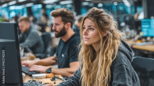 Office workers sitting at their computers, typing emails in a tech company office