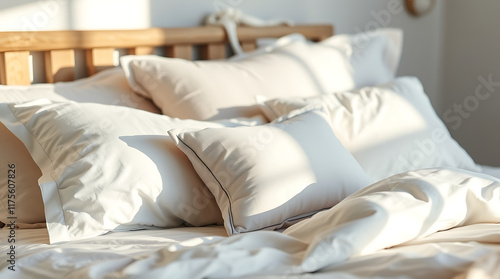 Off-White Pillows and Bedding on Wooden Bed Frame