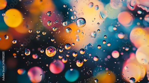 Oil and Water Interaction: A close-up of oil droplets in water, with bright colors reflecting and creating abstract patterns on a dark background.