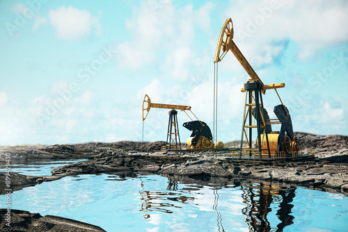 extraction, sky, water, derrick, mining, oil, gas, pump, station, rig, background, concept, creative, nobody, empty, landscape, industry, equipment, machinery, environment, drilling, exploration, energy, crude oil, production, engineering, technology, field, site, crude, fuel, fossil, natural, resource, power, operation, clear, blue, desolate, area, foreground, machine, oilfield, three-dimensional, render, illustration