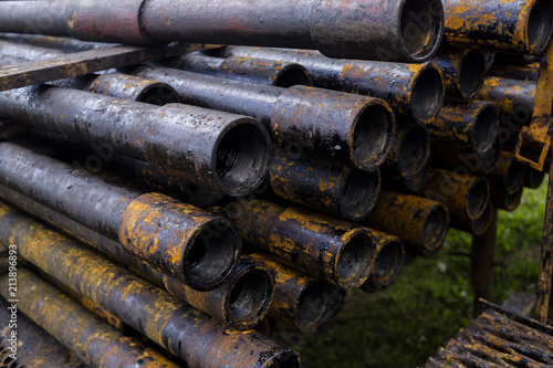 Oil Drill pipe. Rusty drill pipes were drilled in the well section. Downhole drilling rig. Laying the pipe on the deck. View of the shell of drill pipes laid in courtyard of the oil and gas warehouse.